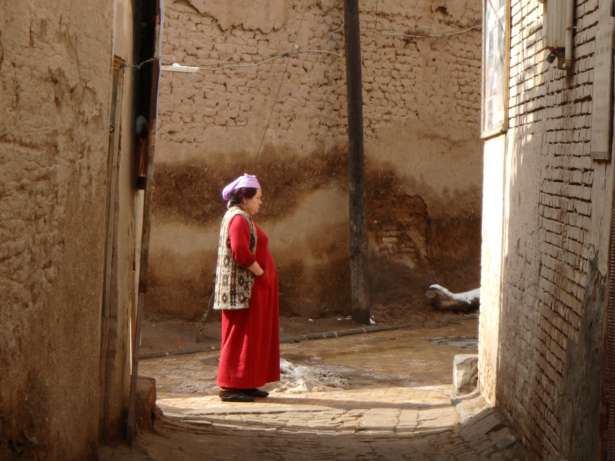 そんなカシュガルの町の北東部の泥の古城を訪れました。連日の雪で道はぬかるみ、坂の多い古城なので階段を上るのに注意を払う必要があるました。西側のビル群を見た後にここに来ると…なんだかとても寂しい気持ちになります。辺りは閑散としていて、おそらくお祈りの時間だったからか人は少なく、物憂げな空気があたりを立ち込めていました。この古城を少し出ると、ウイグルの人たちが生活の糧にしているバザールがにぎわっています。このバザールで働いている人たちの家はこの泥の家なのでしょうか…?