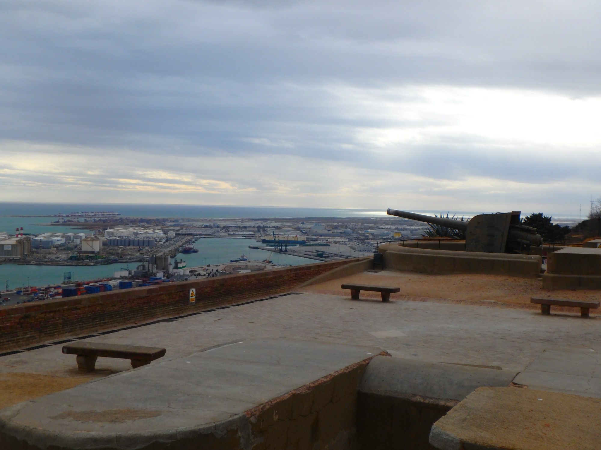 このムンジュイック城、丘の上にあるだけあって、徒歩で行けるのは行けるが…実はバスやロープウェーも充実いしている。残念ながら僕たちが訪れた時はロープウェーはオフシーズンで運休していなくて…結局歩いていくことにしました。頂上に着くと城の入り口が見え、海沿いを眼下にしてコンテナ船が多く停泊していました。さすがバルセロナですね…